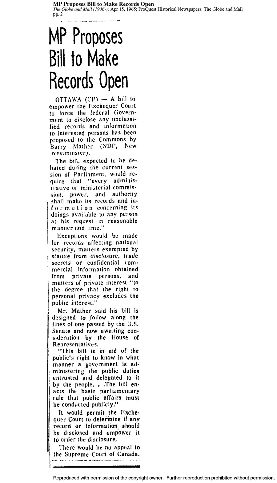 The first person to formally propose freedom of information legislation in Canada was Barry Mather, a New Democrat member of Parliament from New Westminster, British Columbia. The year was 1965 and the bill was modeled off a piece of legislation that the United States Senate had recently voted through. (The American law was finalized in 1966.)