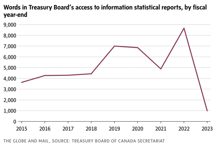 That’s a significant drop. Prior to 2022-23, the government was averaging 5,500 words per report. This amounts to an 82-per-cent drop compared with the average, or an 89-per-cent drop compared with the previous year.