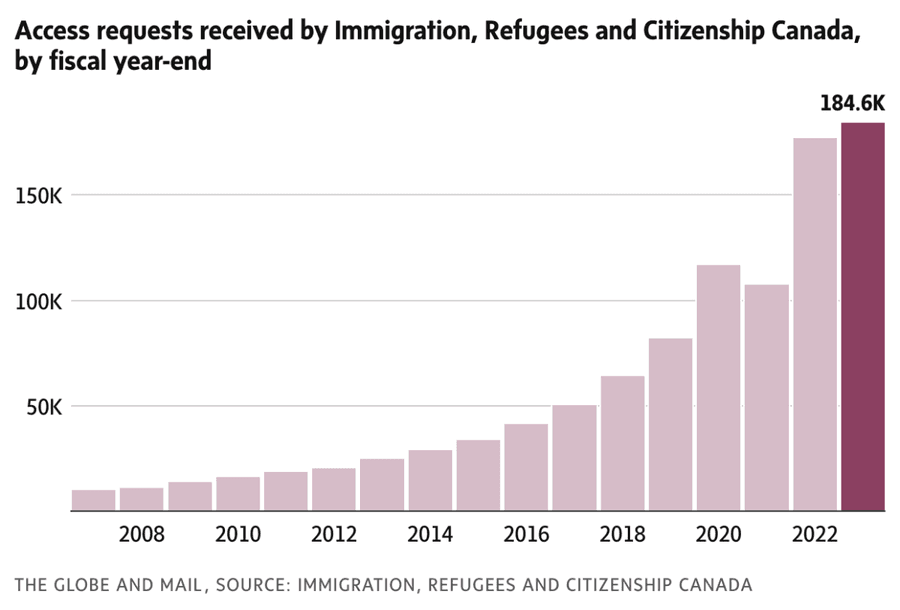 Staff in IRCC’s access office may be breathing a small sigh of relief, however: The department saw a 4-per-cent year-over-year increase in access requests – far less than the 65-per-cent uptick they’d logged the previous year.