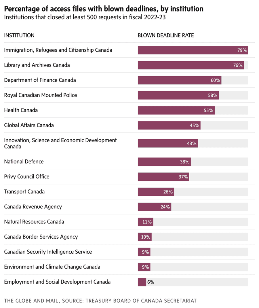 If we expand our criteria to look at all federal institutions, a handful of bodies managed worse rates than IRCC. The Canadian Museum of Nature (two access requests) and the Office of the Administrator of the Ship-source Oil Pollution Fund (one access request) both had 100-per-cent lateness rates. They were followed by the Communication Security Establishment (54 requests, 81 per cent of which were late) and the National Arts Centre (5 requests, 80 per cent).