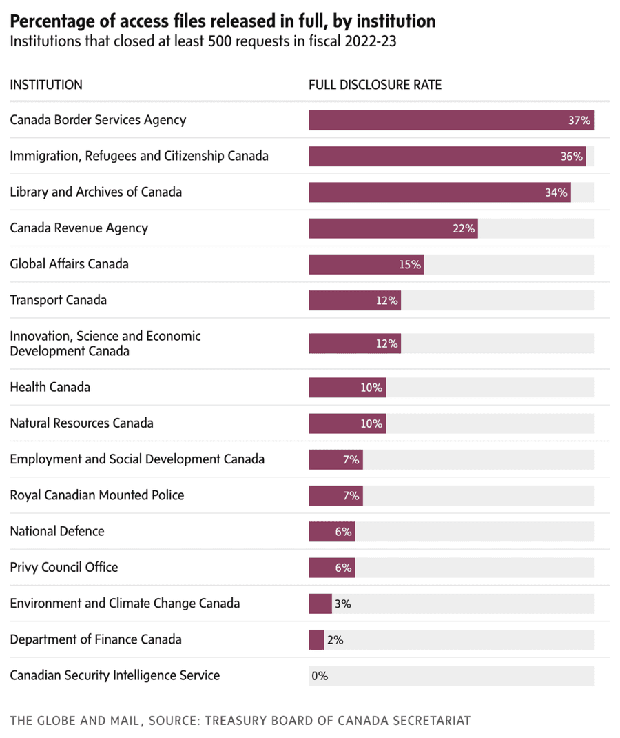 Among major institutions, the Canada Border Services Agency managed the best full disclosure rate, at 37 per cent. IRCC came close behind (36 per cent), followed by Library and Archives Canada (34 per cent), the Canada Revenue Agency (22 per cent) and Global Affairs Canada (15 per cent). On the other end, the Canadian Security Intelligence Service, which closed 1,320 requests in 2022-23, released just four in full, for a disclosure rate of 0.3 per cent.
