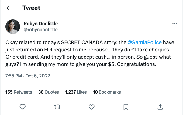 (An aside on payment methods: Most jurisdictions will ask for payment in cheque form. If you don’t have a chequebook, be prepared to fork over $50 to your bank for one; very few public bodies accept credit cards for anything beyond the filing fee. This can lead to some silly situations: A few years ago, I needed to file a federal access request to an institution that didn’t take payment online, but was fresh out of cheques, and a new chequebook would’ve taken weeks to arrive. So I went to a brick-and-mortar bank and got the teller to cut me a money order. They were very confused when I told them it was payable to the “Receiver General of Canada” (the standard payee for federal requests), and even more confused when I told them the money order was for $5 (the actual fee to draft a money order was $7.50). These kinds of fee hijinks come up every now and then if you’re a regular requester. When Robyn FOI’d the Sarnia Police Service for Secret Canada, they insisted on the $5 being paid in person and in cash; her mom, who lives near the Southwestern Ontario city, drove over to make the payment.)