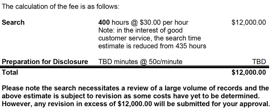 Most processing fees were on the order of $10 to $30. We paid those out immediately. But some organizations asked for more. In those cases, before paying, we tried to understand how they’d arrived at the fee, then attempted to negotiate down. For instance, Robyn managed to get one public body down from $180 to $45 after some back and forth.