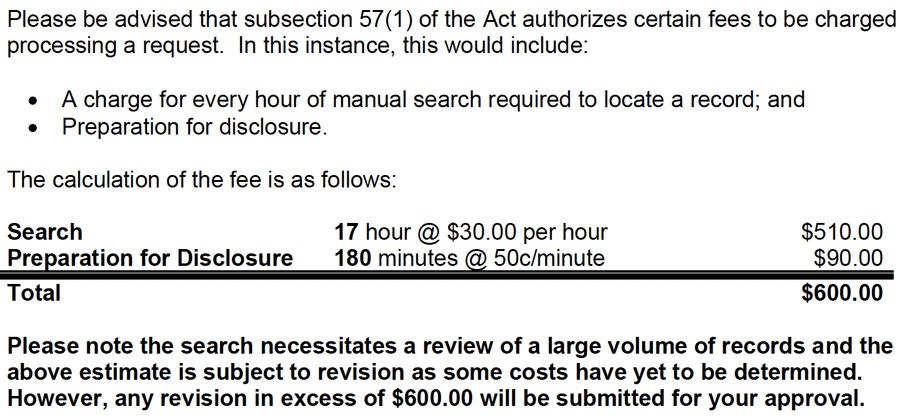 Please be advised that the Freedom of Information and Protection of Privacy Act authorizes certain fees to be charged for processing a request. In this instance, this would include a charge for every hour of manual search required to locate a record and preparation for disclosure. The calculation of the fee is as follows…