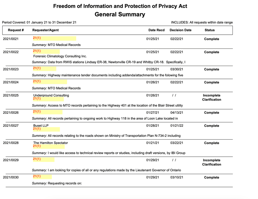 We are conducting a study of how freedom of information requests are processed across the country. To that end, we are requesting information relating to how these requests are dealt with by your office. Please provide us with an electronic (that is, machine-readable) record of all requests received between January 1, 2021 and end of day December 31, 2021, whether completed or not. Please include fields containing the following information: request number, request summary, type of requester (academic, media, etc.), whether the request is sensitive or contentious, date received, date request completed, disclosure decision, reason for time extension, extension duration in days, exemptions applied, whether it was subject to an appeal, and number of pages disclosed. We recognize your system may not capture all of these fields. If thats the case, please give us the fields you do have. Please provide in an electronic format such as Excel or delimited text (e.g. CSV). Do not provide PDF or image files.