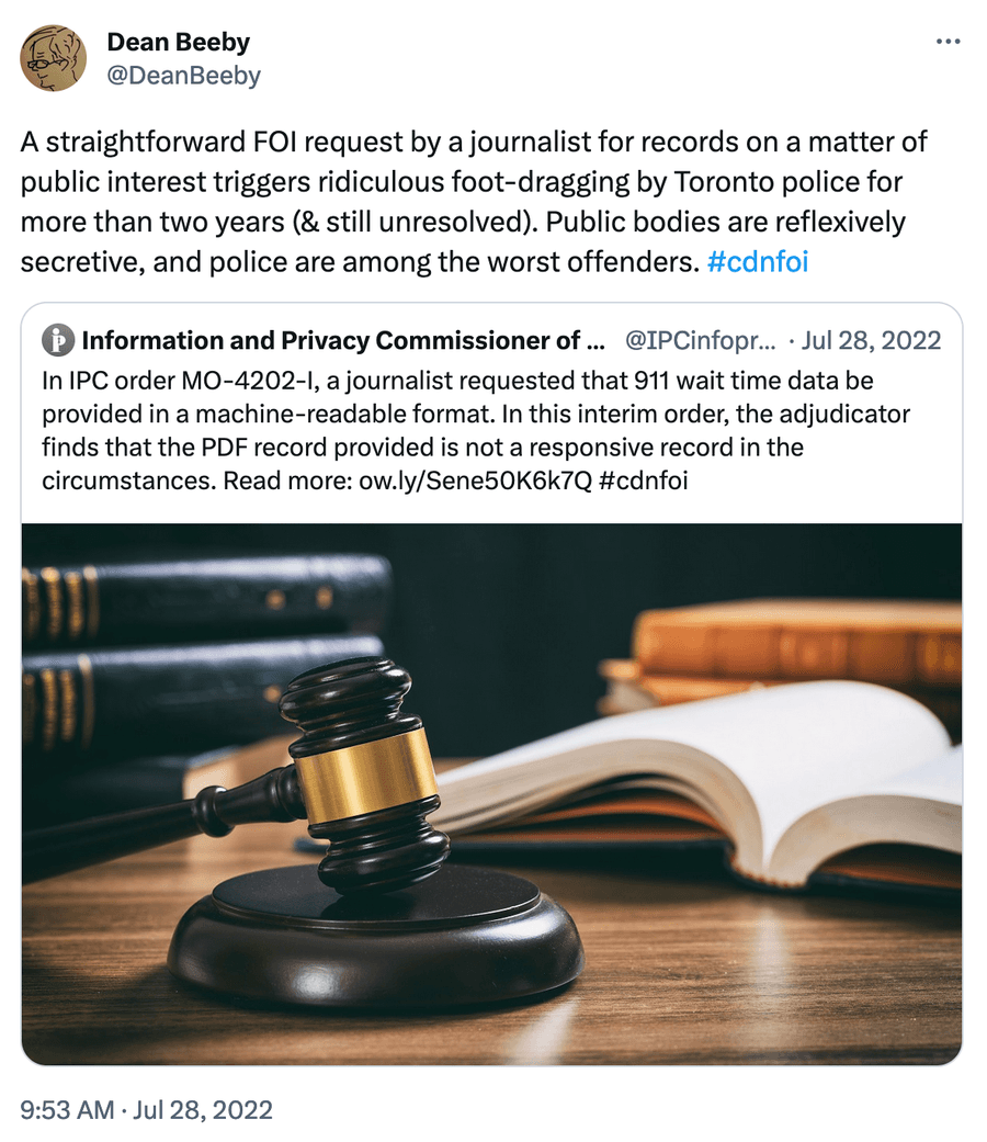As one FOI watchdog tweeted: “A straightforward FOI request by a journalist for records on a matter of public interest triggers ridiculous foot-dragging by Toronto police for more than two years (& still unresolved). Public bodies are reflexively secretive, and police are among the worst offenders. #cdnfoi”